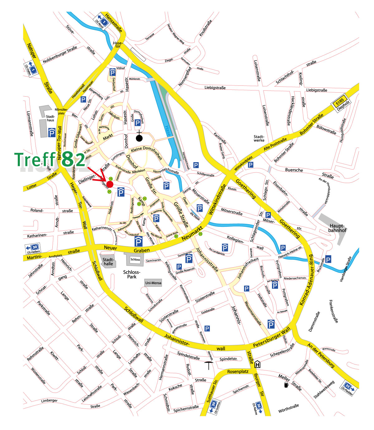 Der Ein­gang zum Treff 82 befin­det sich im Niko­lai­zen­trum schräg gegen­über der Gast­stät­te „Alte Post­hal­te­rei“ direkt neben dem Spie­le­ge­schäft „Spiel­traum“ im glei­chen Zugang der „Ite­bo“. Bit­te klin­geln Sie links vom Ein­gang bei „Treff 82“, im drit­ten Stock befin­den sich die Räum­lich­kei­ten. Ein Fahr­stuhl ist vor­han­den. Kos­ten­pflich­ti­ge Park­mög­lich­kei­ten sind im Park­haus „Niko­lai-Gara­ge“ direkt im Nikolaizentrum.