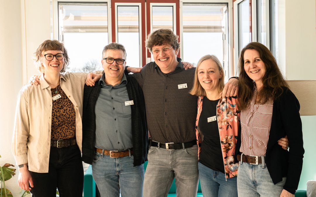 Am 07.03.2025 fei­er­te die Tages­stät­te ihr 30-jäh­ri­ges Jubi­lä­um. Wir erleb­ten gemein­sam mit unse­ren Teil­neh­men­den und deren Ange­hö­ri­gen und Freun­den einen schö­nen Vor­mit­tag mit Ein­bli­cken in unse­re Bewe­gungs­grup­pe, die Gebär­den­sprach­grup­pe, die Ergo­the­ra­pie sowie die Koch­grup­pe. Letz­te­re zau­ber­te uns zur Mit­tags­zeit ein paar lecke­re Sup­pen. Dies run­de­te unse­re Fei­er­lich­kei­ten ab. Außer­dem besuch­te uns die Neue Osna­brü­cker Zei­tung (NOZ) und neben vie­len Fra­gen und der Teil­nah­me an den Grup­pen­an­ge­bo­ten wur­den auch eini­ge Fotos geschos­sen. Daher nut­zen wir nun eins der Fotos um unser Team der Tages­stät­te vor­zu­stel­len. Von links nach rechts sind auf dem Foto zu sehen: Ergo­the­ra­peu­tin Fabia Klin­ken­borg, Geschäfts­füh­rer Tobi­as Mar­quardt, Sozi­al­päd­ago­ge Jür­gen Elix­mann und die bei­den Sozi­al­päd­ago­gin­nen Tina-Marie Schür­mann und Nad­ja Roth.
